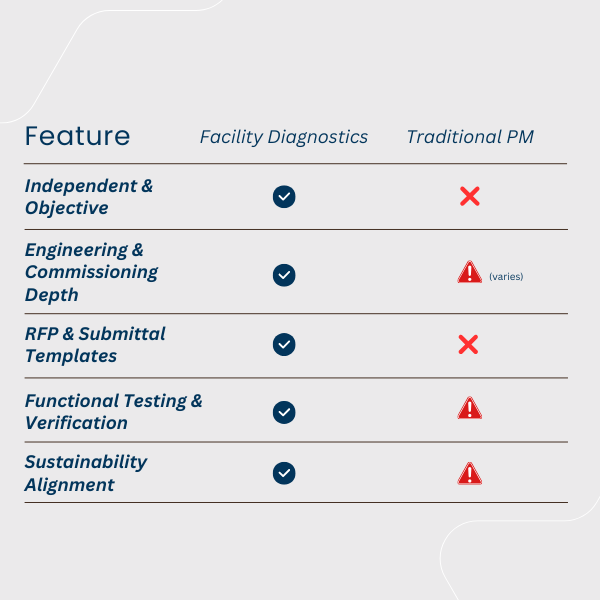 Facility Diagnostics bridges the gap between vision and verified performance. As your advocate, we ensure every contractor delivers to spec—and every system performs as intended.